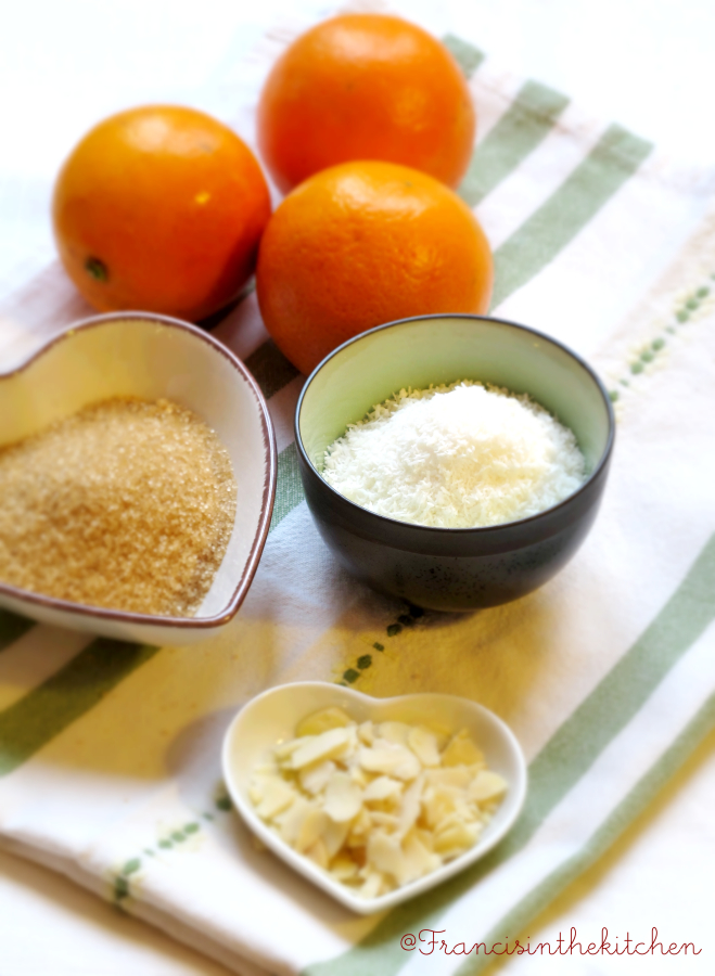 Iniziate pelando le arance (a seconda della misura vedrete quante ne servono per ottenere 300 gr di polpa frullata, io ne ho utilizzate 3). Frullatele e unite il cocco grattugiato mescolando il tutto in modo che si assorba.