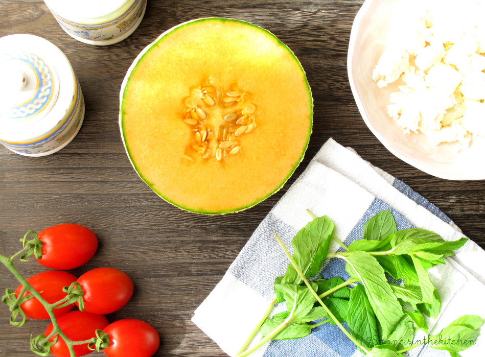In una ciotola mettete il melone tagliato a cubetti, unite i pomodorini lavati e tagliati e la feta anch’essa a cubetti.