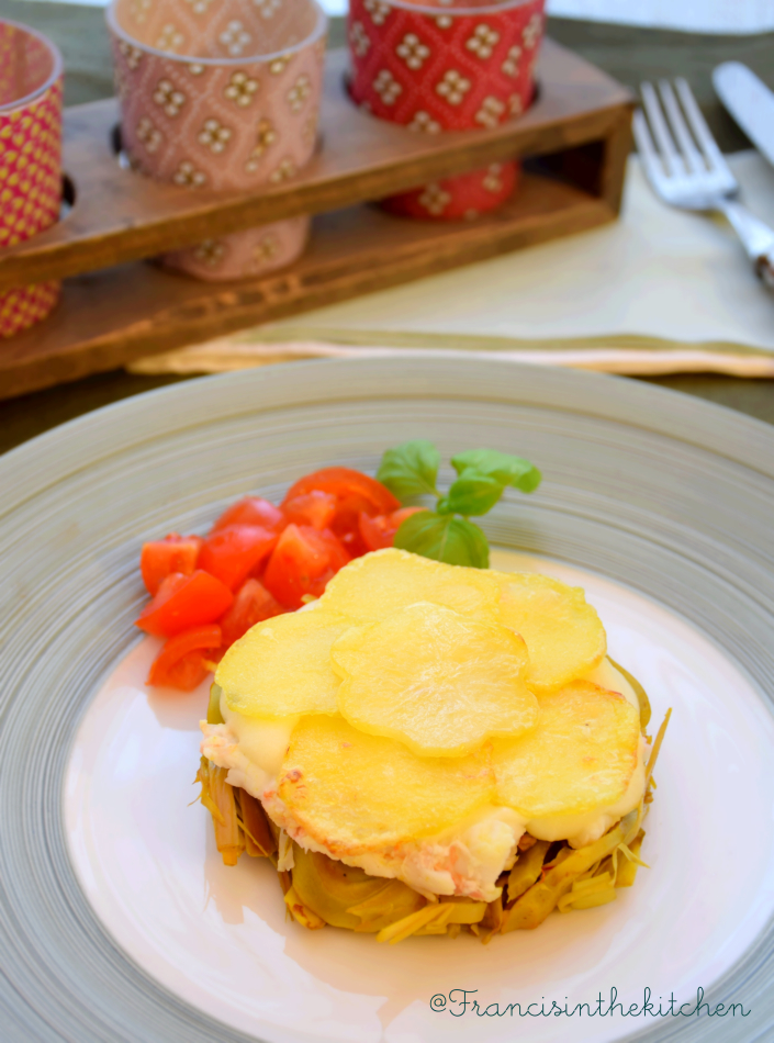 Continuo con il menu di Pasqua al contrario: siamo partiti dal dolce ed ecco il piatto principale… non essendo io una particolare amante della carne ed in particolare dell’agnello ho pensato ad un secondo di pesce. Per la preparazione ci vuole un po’ di tempo perché bisogna preparare tutte le varie parti che poi andranno a comporre la millefoglie.