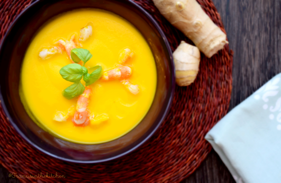 Quando le verdure saranno cotte frullate tutto con un frullatore ad immersione fino a quando la consistenza non sarà quella di una crema, salate e pepate. Una volta preparati i piatti con la vellutata grattugiate su ognuno lo zenzero fresco a aggiungete i gamberi saltati.
