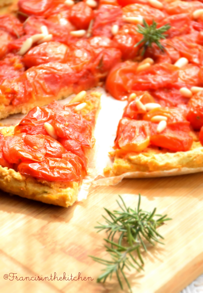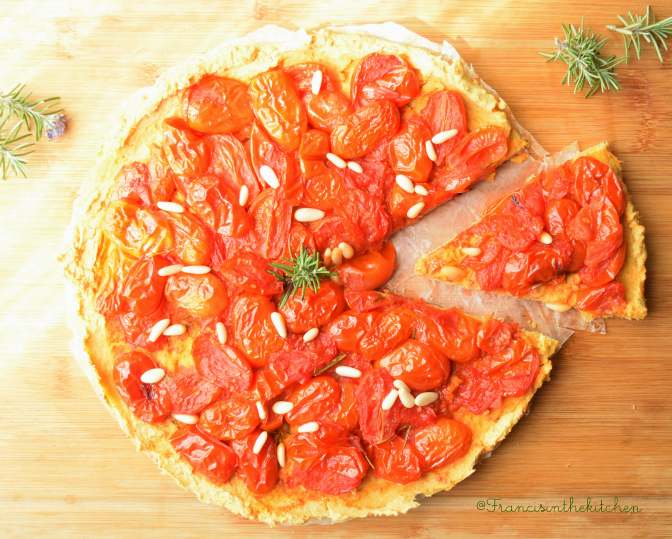 Intanto tirate fuori la base dal forno e versatevi sopra i pomodorini in modo da ricoprire tutta la superficie. Rimettete in forno per 20 minuti poi aggiungete dei pinoli e cuocete ancora in forno per 5 minuti circa con la funzione “solo sotto”. La tatin è pronta: l’unione tra l’acidità dei pomodorini confit ed i ceci vi conquisterà!