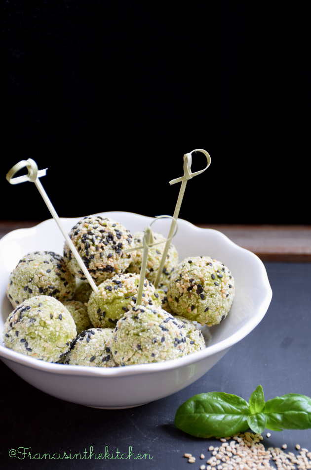 Lasciate riposare il composto in frigo per mezzoretta, intanto scaldate il forno a 200°.Finito il tempo di riposo formate le polpette e passatele nel pan grattato al quale avrete unito anche il sesamo bianco e nero. Foderate una teglia con della carta forno, riponetevi le polpette e infornate per 15 minuti girandole a metà cottura.